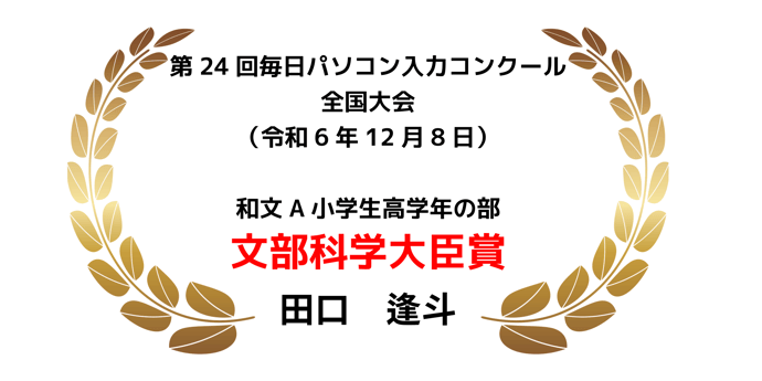 12月8日に、国立オリンピク記念青少年総合センター(東京都)で開催された「第24回毎日パソコン入力コンクール」において、「和文A小学生高学年の部」に出場した当スクール生の田口逢斗くんが、見事1位となり「文部科学大臣賞」に輝きました。