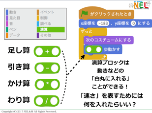 (3)例題にある3人の「速さ」を計算します。その後、Scratchの「演算」の中から、何を使えば例題の計算を速さとして表現できるのかを考えて、試してもらいました。(例題のAさんだけ)