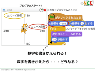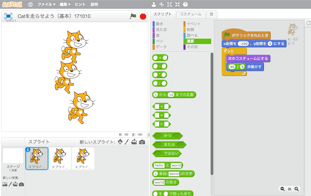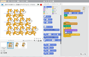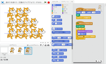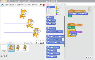 前時で学んだプログラム(ねこの複製、座標での位置の設定)を思い出して応用している様子を、あちこちで見ることができました。