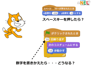 「〇回繰り返す」の数が大きくなると、ねこが走る長さが長くなる。数が小さいと走る長さが短くなることに気付いていきます。